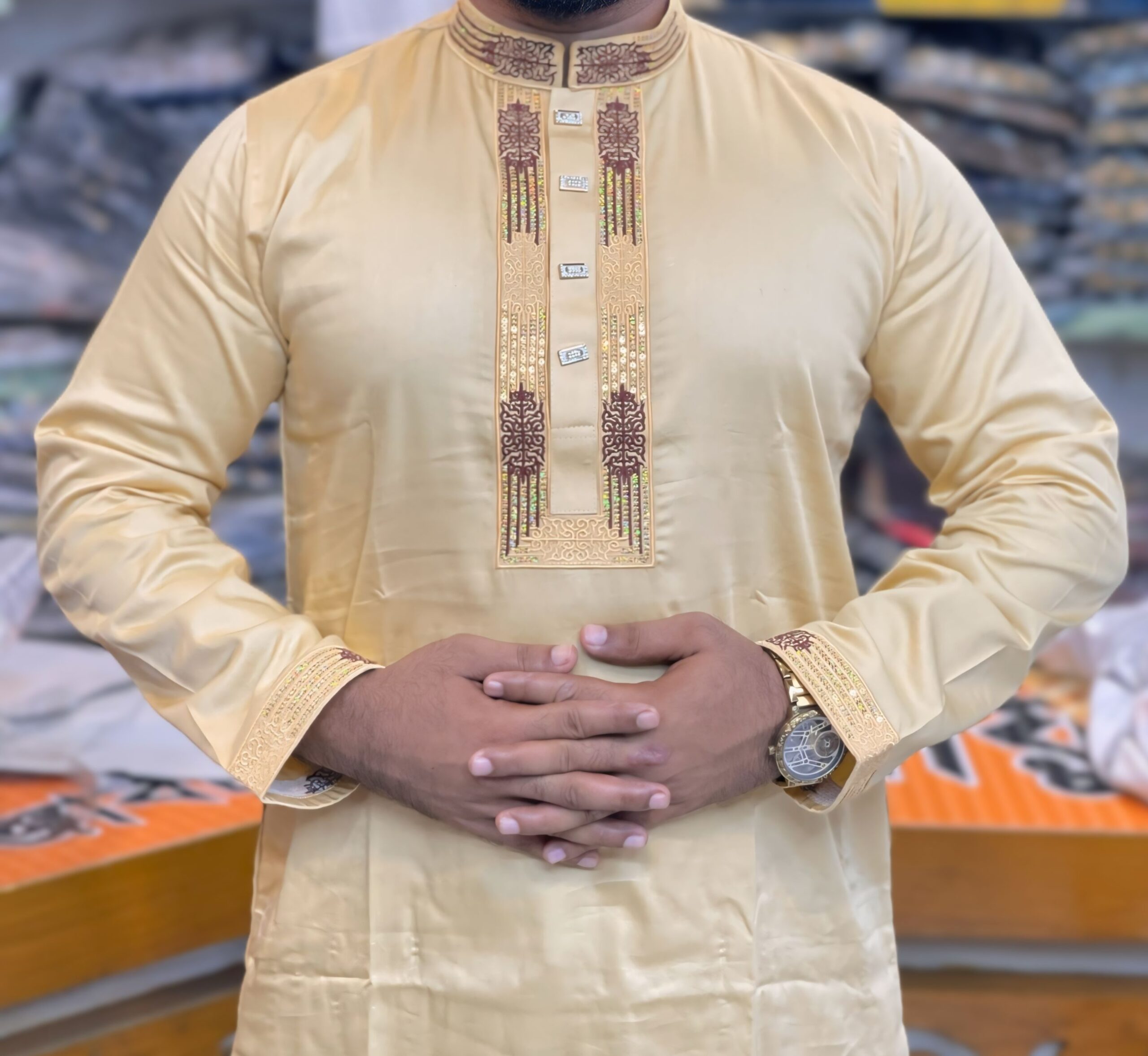 💛 স্টাইলিশ ও রিচ লুকের জন্য পারফেক্ট একটি পাঞ্জাবি! অনুষ্ঠান, পার্টি বা স্পেশাল ডে-তে আপনাকে দেবে রিয়েল ক্লাসিক লুক!